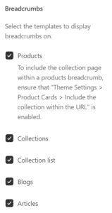 - Breadcrumbs can be shown on five templates by selecting them from the list below.