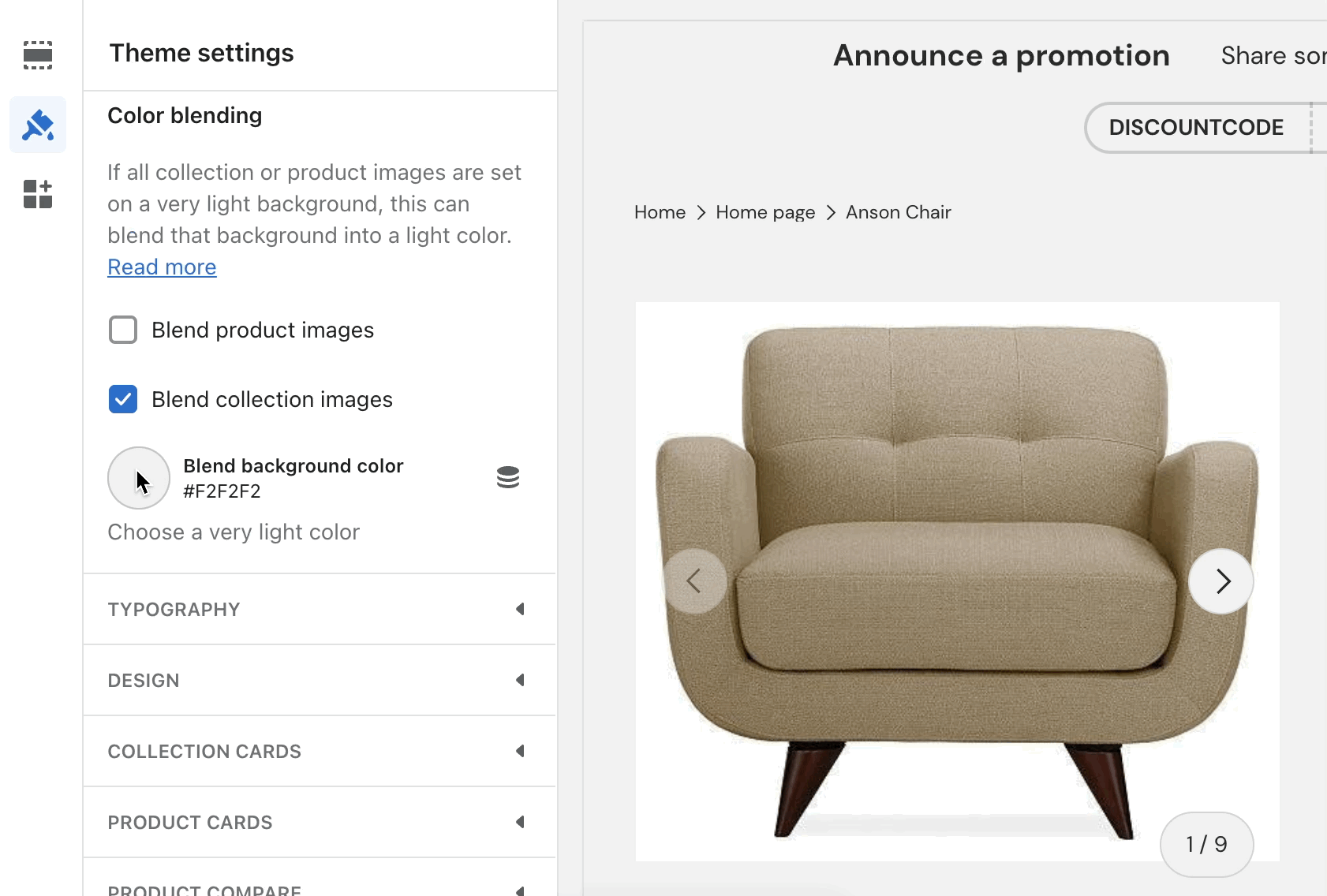 Blend product images: Will blend product card images with light backgrounds to the Blend background color selected.