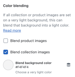 Blend collection images: Will blend the collection image on a collection list or collection section with light backgrounds to the Blend background color setting selected.