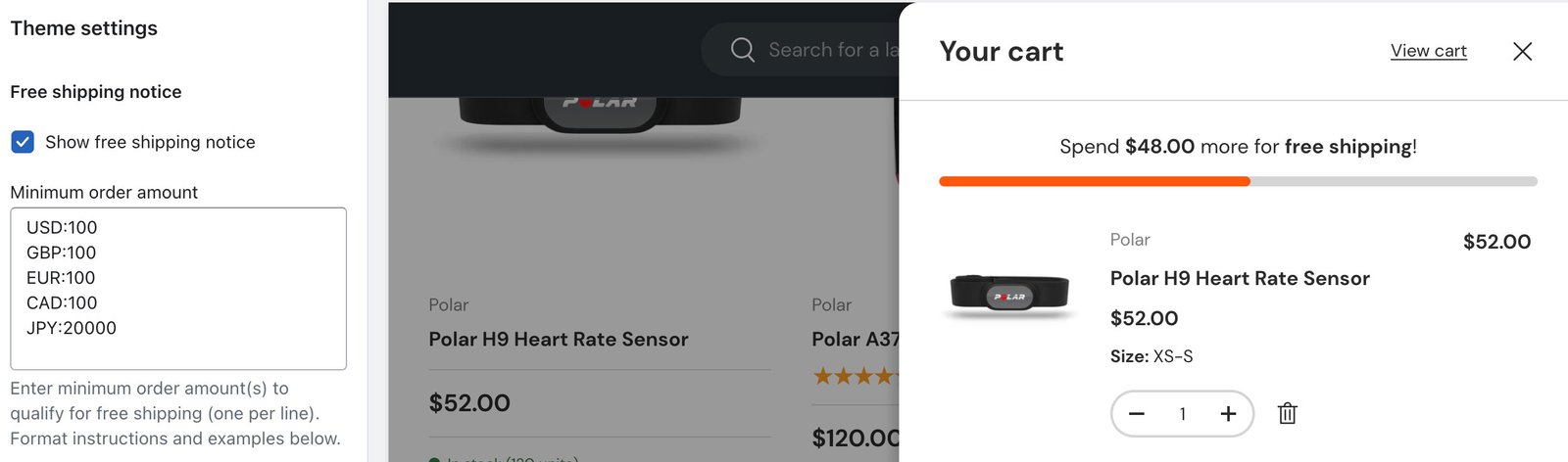 Once set up, the free shipping notice will show within the cart drawer and on the cart page.