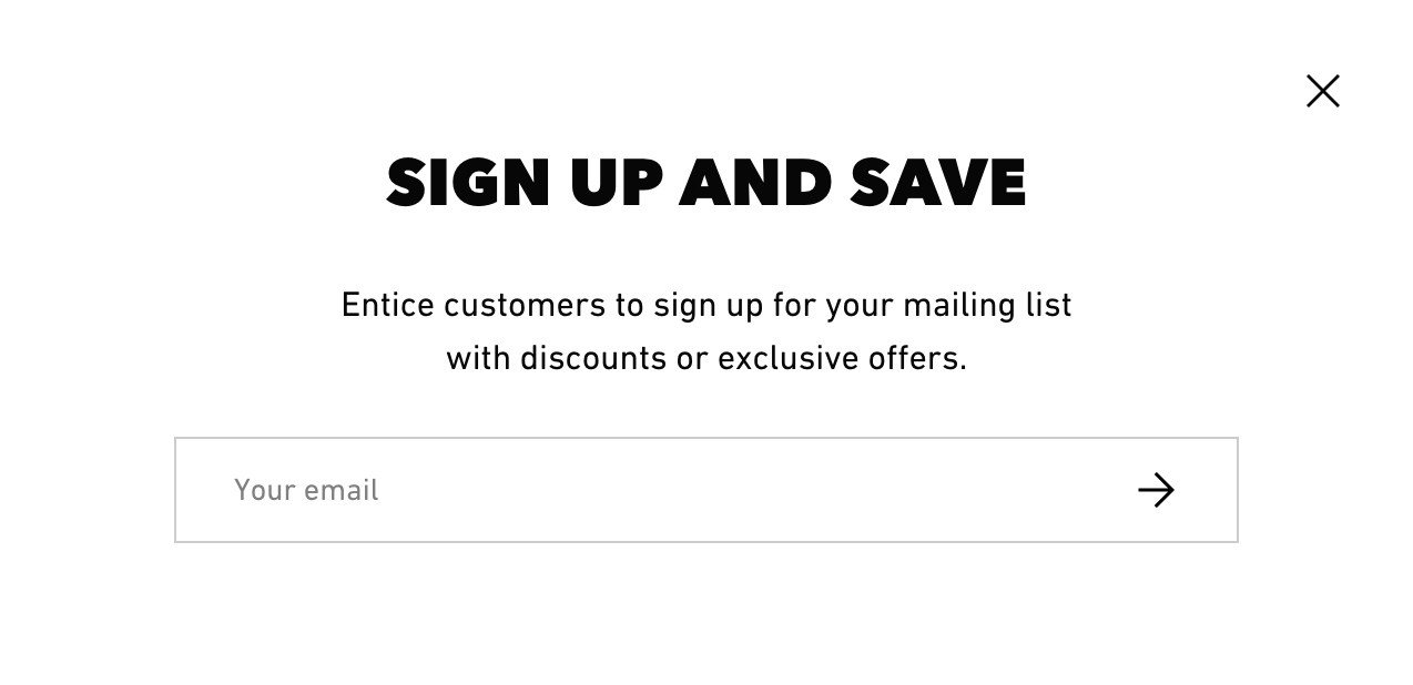 - By default, the Pop-up comes pre-loaded with a Heading, Text and Email sign-up block, but up to 10 blocks can be added in total. Choose from any combination of Heading, Subheading, Text, Image, Button, Email sign-up, Social links, Countdown timer, and Discount code. Note that up to a maximum of two Text blocks can be added to each Pop-up.
