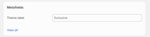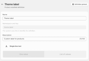 - In the Shopify admin area, create a Single line text product metafield with the namespace and key ‘theme.label’. Choose the type One value. Note – Do not select List of Values or you will get additional characters around your Theme label.