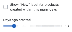 Displays by inclusion in a particular selected collection, and/or by use of a defined product tag. Enterprise also provides the option to use this label on products that have been created within a certain number of days. This is set by enabling this setting and then using the slider in the Product labels settings area.