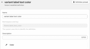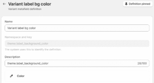 - Next, create a ‘Color’ variant metafield with the key either “theme.label_background_color” and / or “theme.label_text_color”. This is optional, and if actioned will override the default colors inherited from Product labels > Custom label and will therefore allow different colors per variant label.