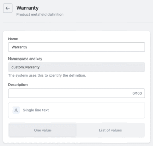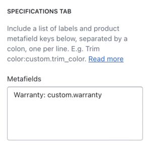 In the above, ‘Warranty’ is the label shown in the tab, and ‘custom.warranty’ is the metafield key as set in the Shopify admin area, as seen below.