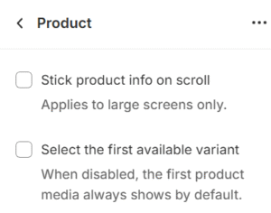 In version 1.6.0 and above, the Select first available variant setting is present. To ensure customers make an intentional selection and don’t default to the first available variant, deselect the Select first available variant option.
