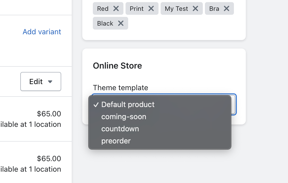 Once created, the templates can be assigned to individual products by editing the product within the Shopify dashboard: